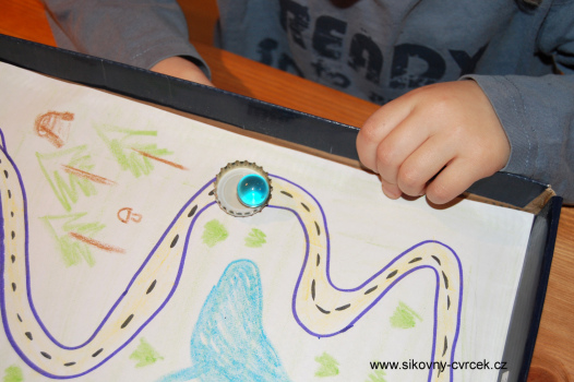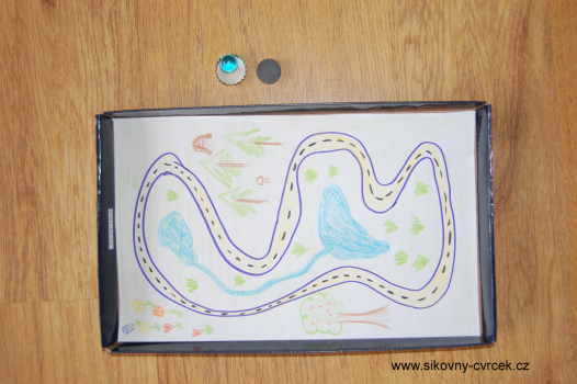 Kuličku ve víčku položíme na nakreslenou dráhu. Ovládáme ji magnetem ze spodní strany víka krabice.