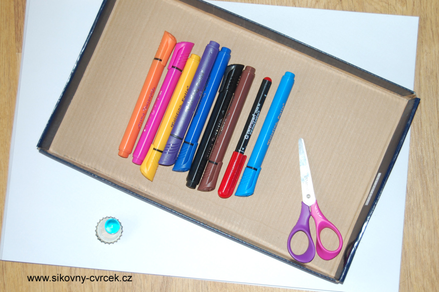 Potřeby: víko z krabice od bot, papír, kreslící potřeby, nůžky, magnet, kulička, kovové víčko od nápojů (pivo :-).