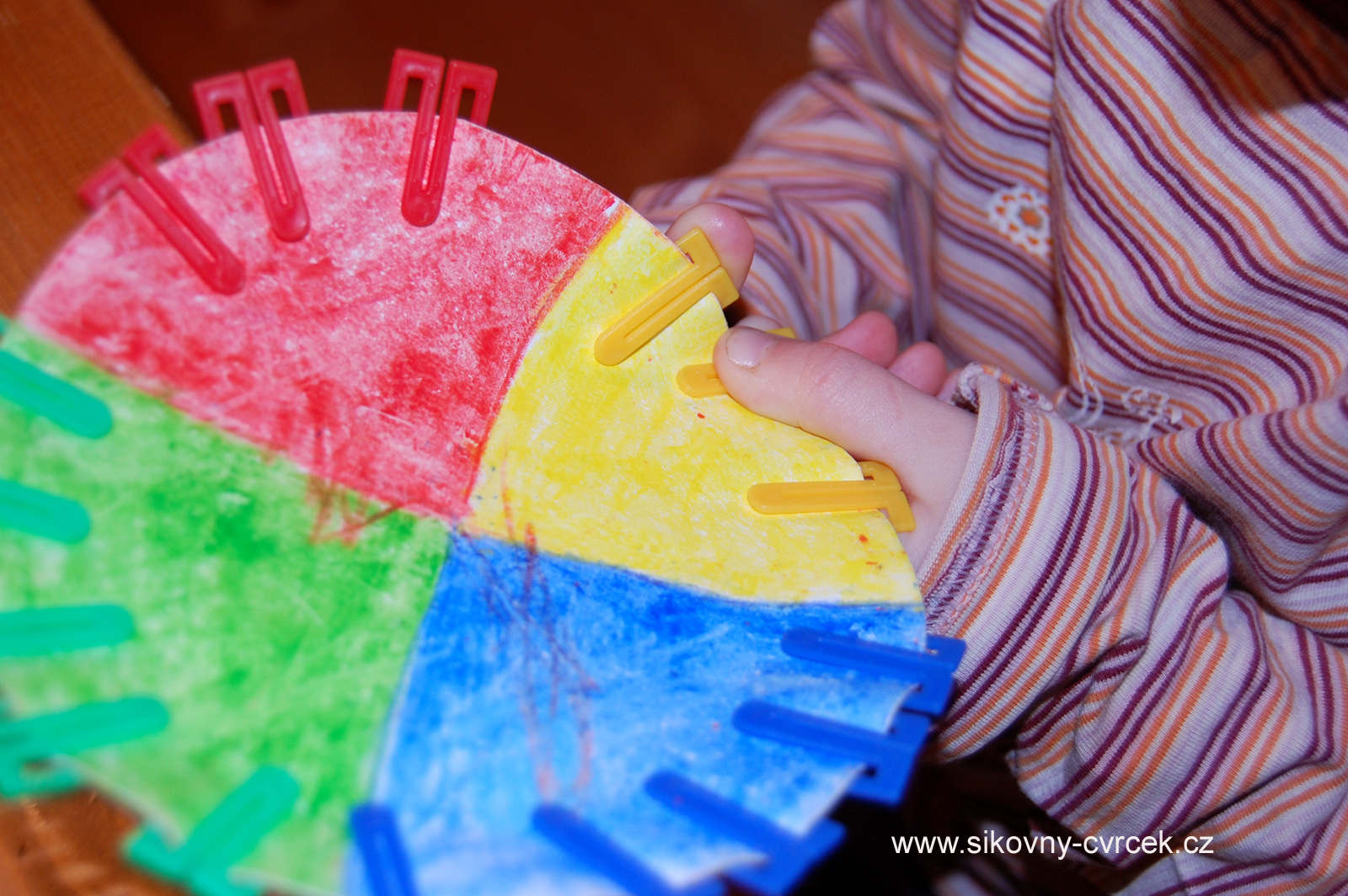 Pak už jen ukážeme dítěti, jak se sponky nasazují. Pro děti je to velmi těžké, ale po nějaké době to zvládají velmi dobře. My dáváme Barey sponky ve více barvách, než jaké má na kolečku a necháváme jí barvy selektovat.